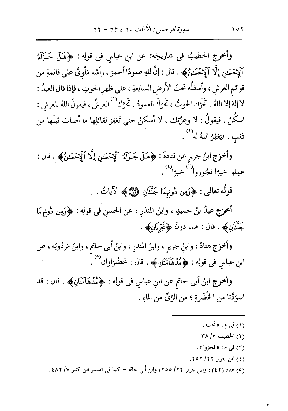 وأخرج ابن جرير عن قتادة {هل جزاء الإحسان إلا الإحسان} قال : عملوا خيرا فجزوا خيرا ، قوله تعالى : {ومن دونهما جنتان} الآيات.