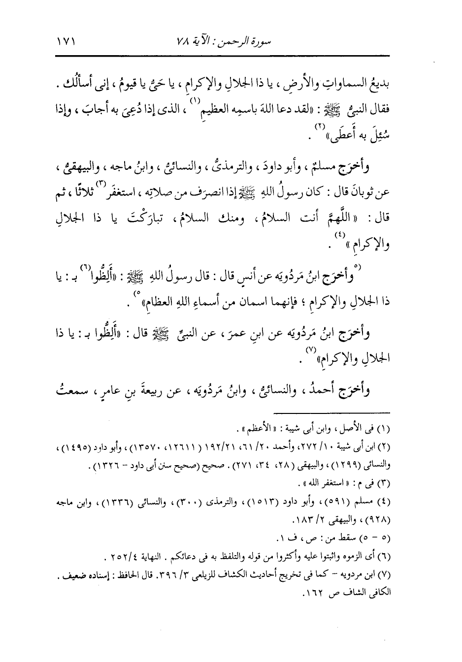 وأخرج ابن مردويه عن ابن عمر عن النَّبِيّ صلى الله عليه وسلم قال : ألظوا بيا ذا الجلال والإكرام.