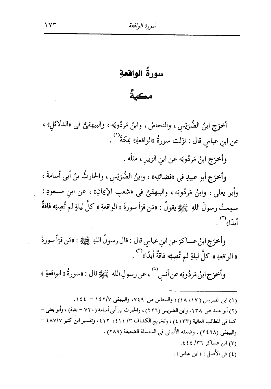 وأخرج أبو عبيد في فضائله ، وَابن الضريس والحرث بن أبي أسامة وأبو يعلى ، وَابن مردويه والبيهقي في شعب الإيمان عن ابن مسعود : سمعت رسول الله صلى الله عليه وسلم يقول : من قرأ سورة الواقعة كل ليلة لم تصبه فاقة أبدا.