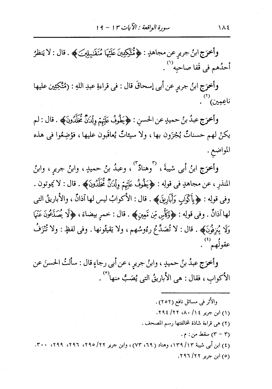 وأخرج ابن أبي شيبة ، وعَبد بن حُمَيد ، وَابن جَرِير ، وَابن المنذر عن سعيد بن جبير في قوله : {لا يصدعون عنها ولا ينزفون} قال : لا تصدع رؤوسهم ولا تنزف عقولهم.