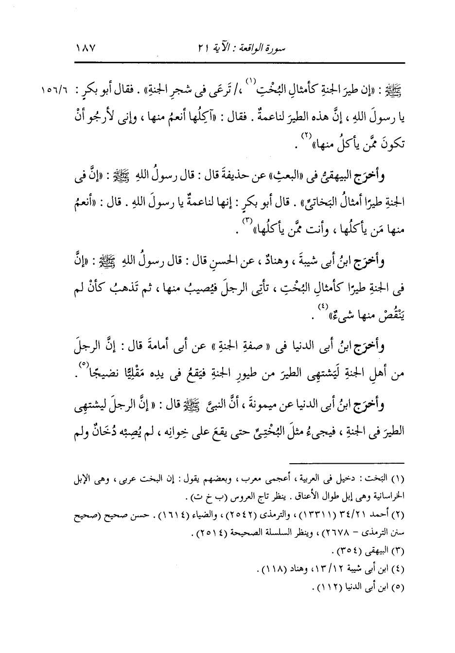 وأخرج ابن مردويه عن ابن مسعود : سمعت رسول الله صلى الله عليه وسلم يقول : إن في الجنة طيرا له سبعون ألف ريشة فإذا وضع الخوان قدام ولي الله جاء الطير فسقط عليه فانتفض فخرج من كل ريشة لون ألذ من الشهد وألين من الزبد وأحلى من العسل ثم يطير.