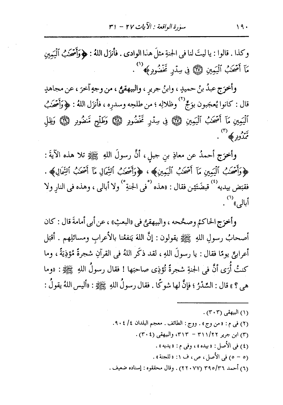 {في سدر مخضود} يخضده الله من شوكة فيجعل مكان كل شوكة ثمرة إنها تنبت ثمرا يفتق الثمر منها عن اثنين وسبعين لونا من الطعام ما فيها لون يشبه الآخر.