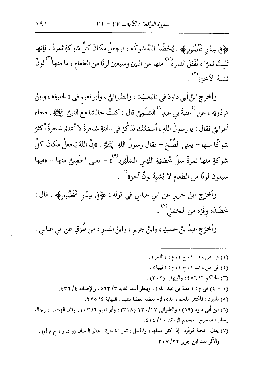 وأخرج الطستي في مسائله عن ابن عباس أن نافع بن الأزرق سأله عن قوله تعالى : {في سدر مخضود} قال : الذي ليس له شوك قال : وهل تعرف العرب ذلك قال : نعم أما سمعت قول أمية بن أبي الصلت : إن الحدائق في الجنان ظليلة * فيها الكواعب سدرها مخضود.