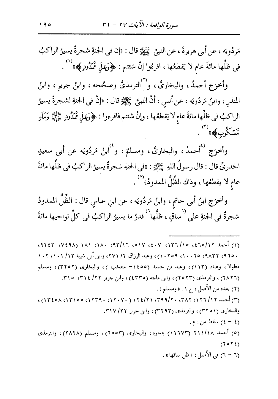 مردويه عن أبي هريرة رضي الله عنه عن النَّبِيّ صلى الله عليه وسلم قال : في الجنة شجرة يسير الراكب في ظلها مائة عام لا يقطعها اقرأوا إن شئتم {وظل ممدود}.