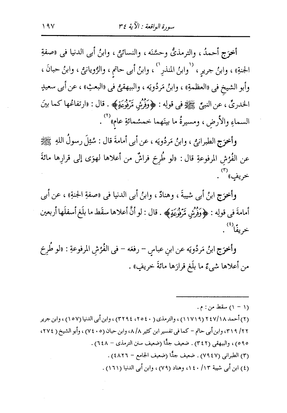 وأخرج أحمد والترمذي حسنه والنسائي ، وَابن أبي الدنيا في صفة الجنة ، وَابن حبان ، وَابن جَرِير ، وَابن أبي حاتم والروياني ، وَابن مردويه وأبو الشيخ في العظمة والبهيقي في البعث عن أبي سعيد الخدري عن النَّبِيّ صلى الله عليه وسلم : في قوله {وفرش مرفوعة} قال : ارتفاعها كما بين السماء والأرض مسيرة ما بينهما خمسمائة عام.