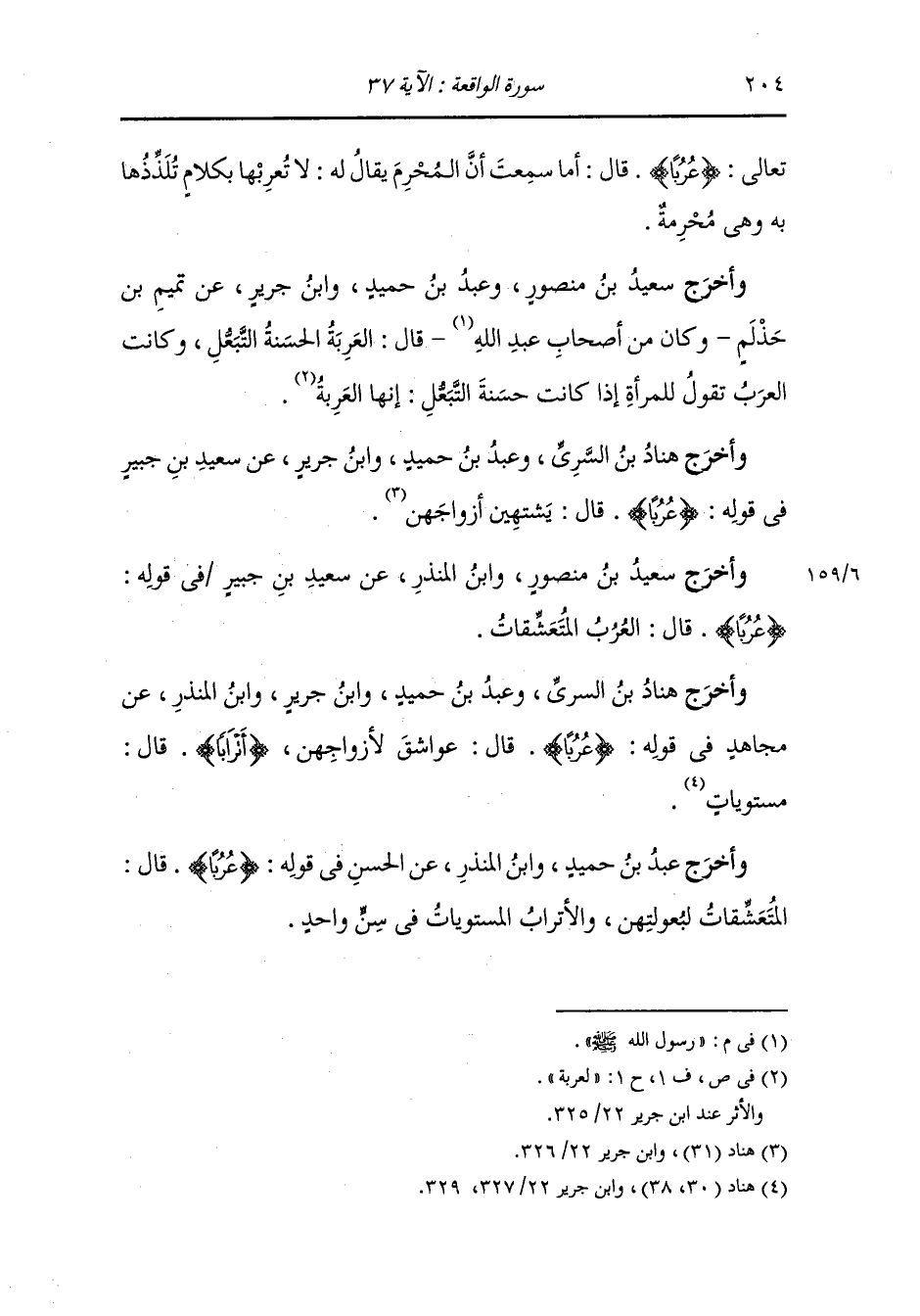 وأخرج سعيد بن منصور ، وعَبد بن حُمَيد ، وَابن جَرِير عن تيم بن جدلم وكان من أصحاب عبد الله قال : العربة الحسنة التبعل وكانت العرب تقول للمرأة إذا كانت حسنة التبعل : إنها العربة.