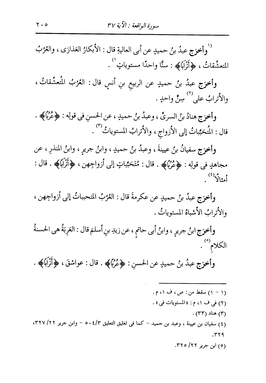 وأخرج سفيان بن عيينة ، وعَبد بن حُمَيد ، وَابن جَرِير ، وَابن المنذر عن مجاهد رضي الله عنه في قوله : {عربا} قال : متحببات إلى أزواجهن {أترابا} قال : أمثالا.