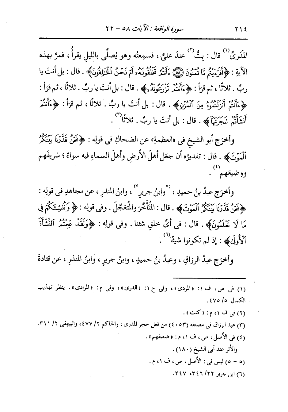 المرادي رضي الله عنه قال : كنت عبد علي رضي الله عنه فسمعته وهو يصلي بالليل يقرأ فمر بهذه الآية {أفرأيتم ما تمنون أأنتم تخلقونه أم نحن الخالقون} قال : بل أنت يا رب ثلاثا
