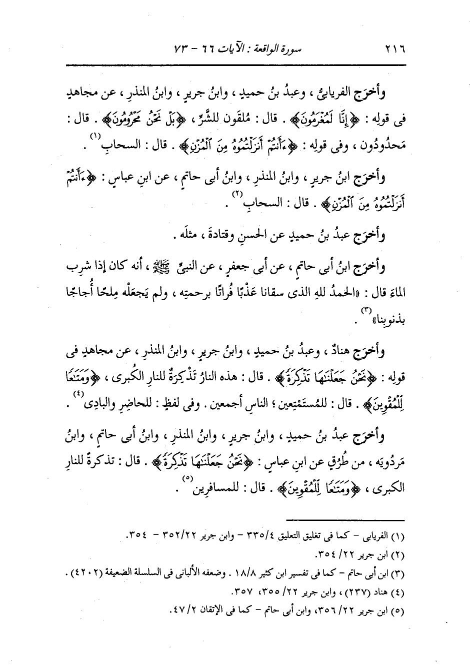 وأخرج عَبد بن حُمَيد ، وَابن جَرِير ، وَابن المنذر ، وَابن أبي حاتم ، وَابن مردويه من طرق عن ابن عباس رضي الله عنهما {نحن جعلناها تذكرة} قال : تذكرة للنار الكبرى {ومتاعا للمقوين} قال : للمسافرين.