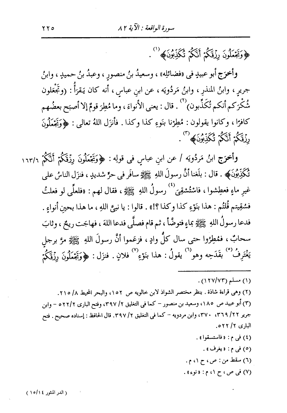 وأخرج أبو عبيد في فضائله وسعيد بن منصور ، وعَبد بن حُمَيد ، وَابن جَرِير ، وَابن المنذر ، وَابن مردويه عن ابن عباس رضي الله عنهماأنه كان يقرأ وتجعلون رزقكم أنكم تكذبون قال : يعني الأنواء وما مطر قوم إلا أصبح بعضهم كافرا وكانوا يقولون : مطرنا بنوء كذا وكذا فأنزل الله تعالى {وتجعلون رزقكم أنكم تكذبون}.
