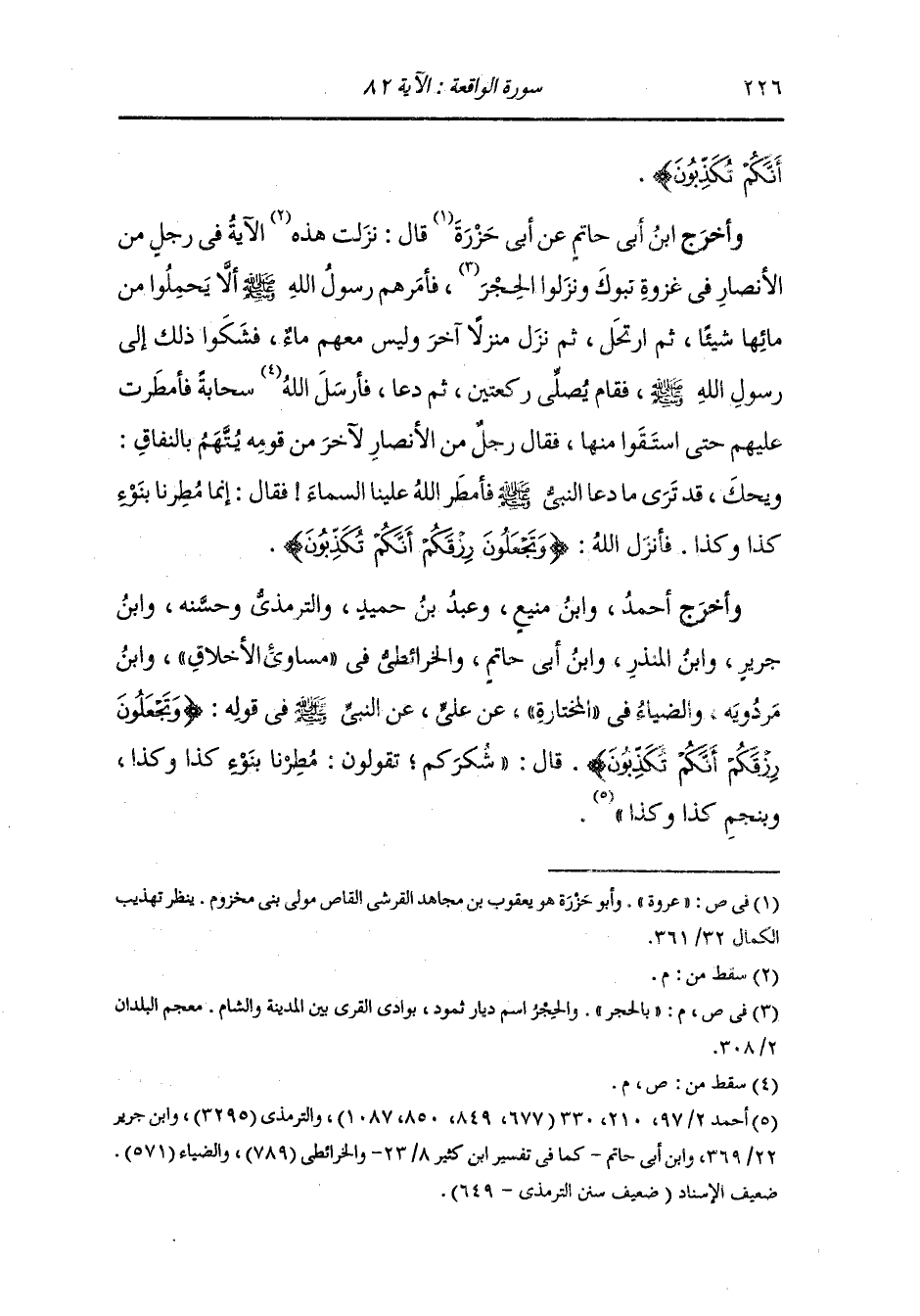 وأخرج ابن أبي حاتم عن أبي حزرة رضي الله عنه قال : نزلت الآية في رجل من الأنصار في غزوة تبوك ونزلوا بالحجر فأمرهم رسول الله صلى الله عليه وسلم أن لا يحملوا من مائها شيئا ثم ارتحل ثم نزل منزلا آخر وليس معهم ماء فشكوا ذلك إلى رسول الله صلى الله عليه وسلم فقام يصلي ركعتين ثم دعا فأرسل سحابة فأمطرت عليهم حتى استقوا منها فقال رجل من الأنصار لآخر من قومه يتهم بالنفاق : ويحك قد ترى ما دعا النَّبِيّ صلى الله عليه وسلم فأمطر الله علينا السماء فقال : إنما مطرنا بنوء كذا وكذا فأنزل الله {وتجعلون رزقكم أنكم تكذبون}.