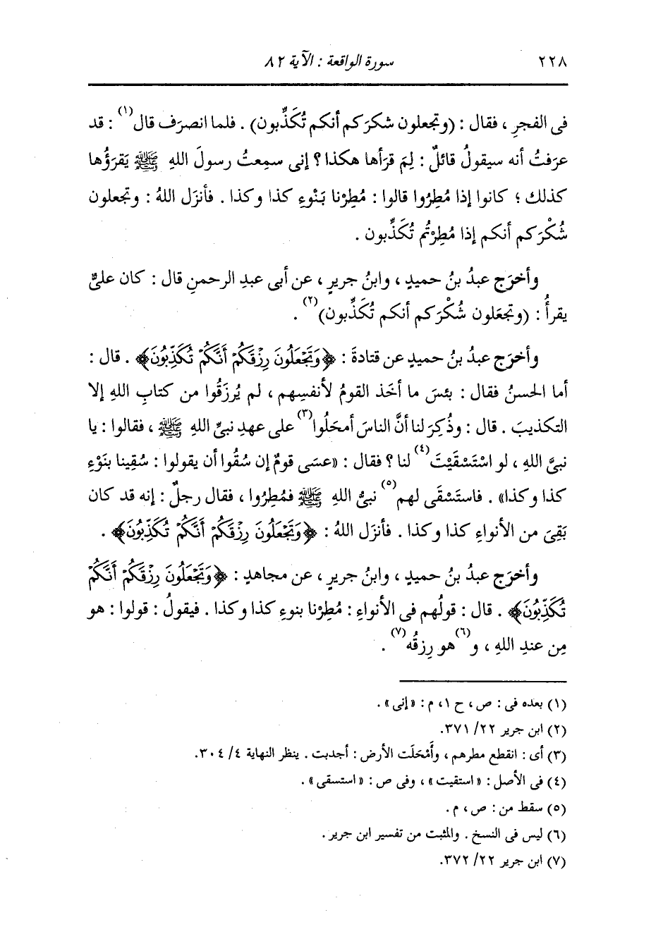 وأخرج عَبد بن حُمَيد عن قتادة رضي الله عنه {وتجعلون رزقكم أنكم تكذبون} فقال : أما الحسن فقال : بئس ما أخذ القوم لأنفسهم لم يرزقوا من كتاب الله إلا التكذيب قال : وذكر لنا أن الناس أمحلوا على عهد نبي الله صلى الله عليه وسلم فقالوا يا نبي الله : لو استقيت لنا فقال : عسى قوم إن سقوا أن يقولوا سقينا بنوء كذا وكذا فاستسقى نبي الله صلى الله عليه وسلم فمطروا فقال رجل : إنه قد كان بقي من الأنواء كذا وكذا فأنزل الله {وتجعلون رزقكم أنكم تكذبون}.