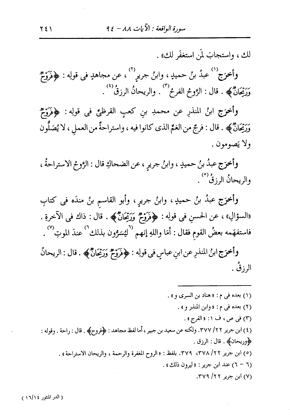 وأخرج هناد بن السرى ، وعَبد بن حُمَيد ، وَابن جَرِير ، وَابن المنذر عن مجاهد في قوله : {فروح وريحان} قال : الروح الفرح والريحان الرزق.