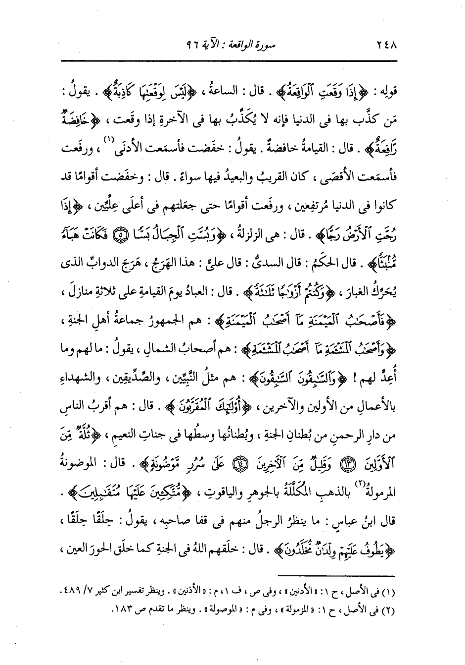 {ليس لوقعتها كاذبة} يقول : من كذب بها في الدنيا فإنه لا يكذب بها في الآخرة إذا وقعت {خافضة رافعة} قال : القيامة خافضة يقول : خفضت فأسمعت الأذنين ورفعت فأسمعت الأقصى كان القريب والبعيد فيها سواء قال : وخفضت أقواما قد كانوا في الدنيا مرتفعين ورفعت أقواما حتى جعلتهم في أعلى عليين {إذا رجت الأرض رجا} قال : هي الزلزلة {وبست الجبال بسا} {فكانت هباء منبثا} قال : الحكم والسدي قال : على هذا الهرج هرج الدواب الذي يحرك الغبار {وكنتم أزواجا ثلاثة} قال : العباد يوم القيامة على ثلاثة منازل {فأصحاب الميمنة ما أصحاب الميمنة} هم : الجمهور جماعة أهل الجنة {وأصحاب المشأمة ما أصحاب المشأمة} هم أصحاب الشمال يقول : ما لهم وما أعد لهم {والسابقون السابقون} هم مثل النبيين والصديقين والشهداء بالأعمال من الأولين والآخرين {أولئك المقربون} قال : هم أقرب الناس من دار الرحمن من بطنان الجنة وبطنانها وسطها في جنات النعيم {ثلة من الأولين وقليل من الآخرين على سرر موضونة} قال : الموضونة الموصولة بالذهب المكللة بالجوهر والياقوت {متكئين عليها متقابلين} قال ابن عباس : ما ينظر الرجل منهم في قفا صاحبه يقول : حلقا حلقا {يطوف عليهم ولدان مخلدون} قال : خلقهم الله في الجنة كما خلق الحور العين