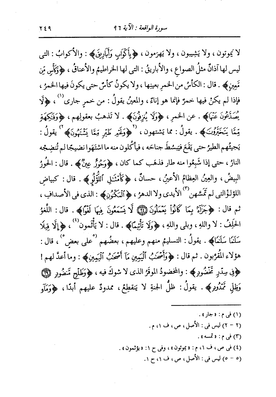 لا يموتون لا يشيبون ولا يهرمون {بأكواب وأباريق} والأكواب التي ليس لها آذان مثل الصواع والأباريق التي لها الخراطم الأعناق {وكأس من معين} قال : الكأس من الخمر بعينها ولا يكون كأس حتى يكون فيها الخمر فإذا لم يكن فيها خمر فإنما هو إناء والمعين يقول : من خمر جار {لا يصدعون عنها} عن الخمر {ولا ينزفون} لا تذهب بعقولهم {وفاكهة مما يتخيرون} يقول : مما يشتهون يقول : يجيئهم الطير حتى يقع فيبسط جناحه فيأكلون منه ما اشتهوا نضجا لم تنضجه النار حتى إذا شبعوا منه طار فذهب كما كان {وحور عين} قال : الحور البيض والعين العظام الأعين حسان {كأمثال اللؤلؤ} قال : كبياض اللؤلؤ التي لم تمسه الأيدي ولا الدهر {المكنون} الذي في الأصداف ، ثم قال {جزاء بما كانوا يعملون لا يسمعون فيها لغوا} قال : اللغو الحلف لا والله وبلى والله {ولا تأثيما} قال : قال لايموتون {إلا قيلا سلاما سلاما} يقول : التسليم منهم وعليهم بعضهم على بعض قال : هؤلاء المقربون ثم قال : {وأصحاب اليمين ما أصحاب اليمين} وما أعد لهم {في سدر مخضود}