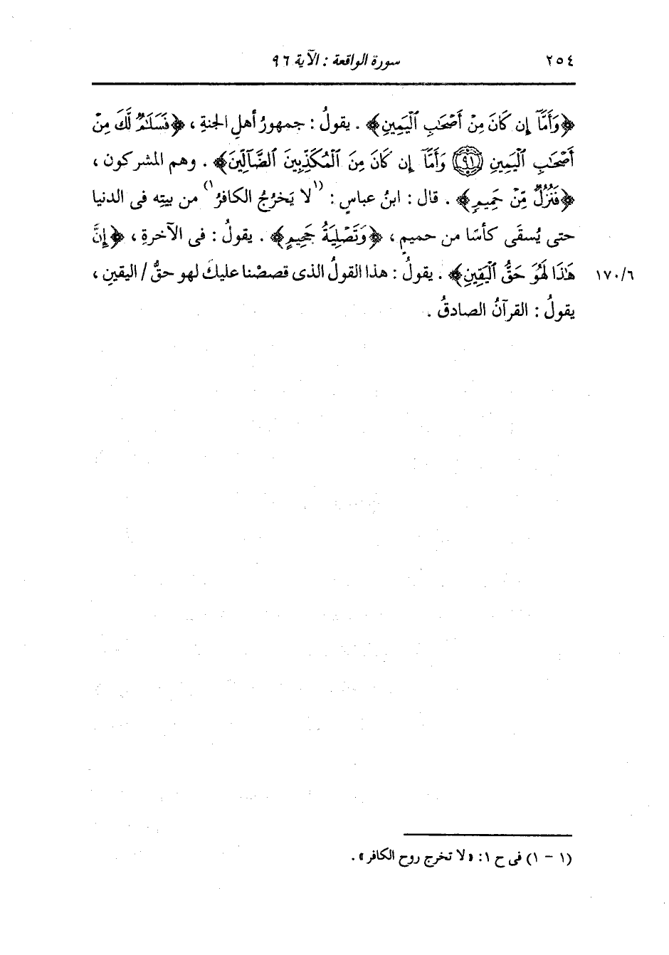 {وأما إن كان من أصحاب اليمين} يقول : جمهور أهل الجنة {فسلام لك من أصحاب اليمين وأما إن كان من المكذبين الضالين} وهم المشركون {فنزل من حميم} قال : ابن عباس رضي الله عنهما لا يخرج الكافر من بيته في الدنيا حتى يسقى كأسا من حميم {وتصلية جحيم} يقول : في الآخرة {إن هذا لهو حق اليقين} يقول : هذا القول الذي قصصنا عليك لهو حق اليقين يقول القرآن الصادق والله أعلم.
