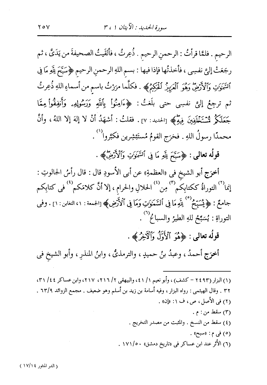 وأخرج أبو الشيخ في العظمة عن أبي الأسود قال : قال رأس الجالوت : إنما التوراة الحلال والحرام إلا أن في كتابكم جامعا {سبح لله ما في السماوات والأرض} وفي التوراة يسبح لله الطير والسباع ، قوله تعالى : {هو الأول والآخر}.