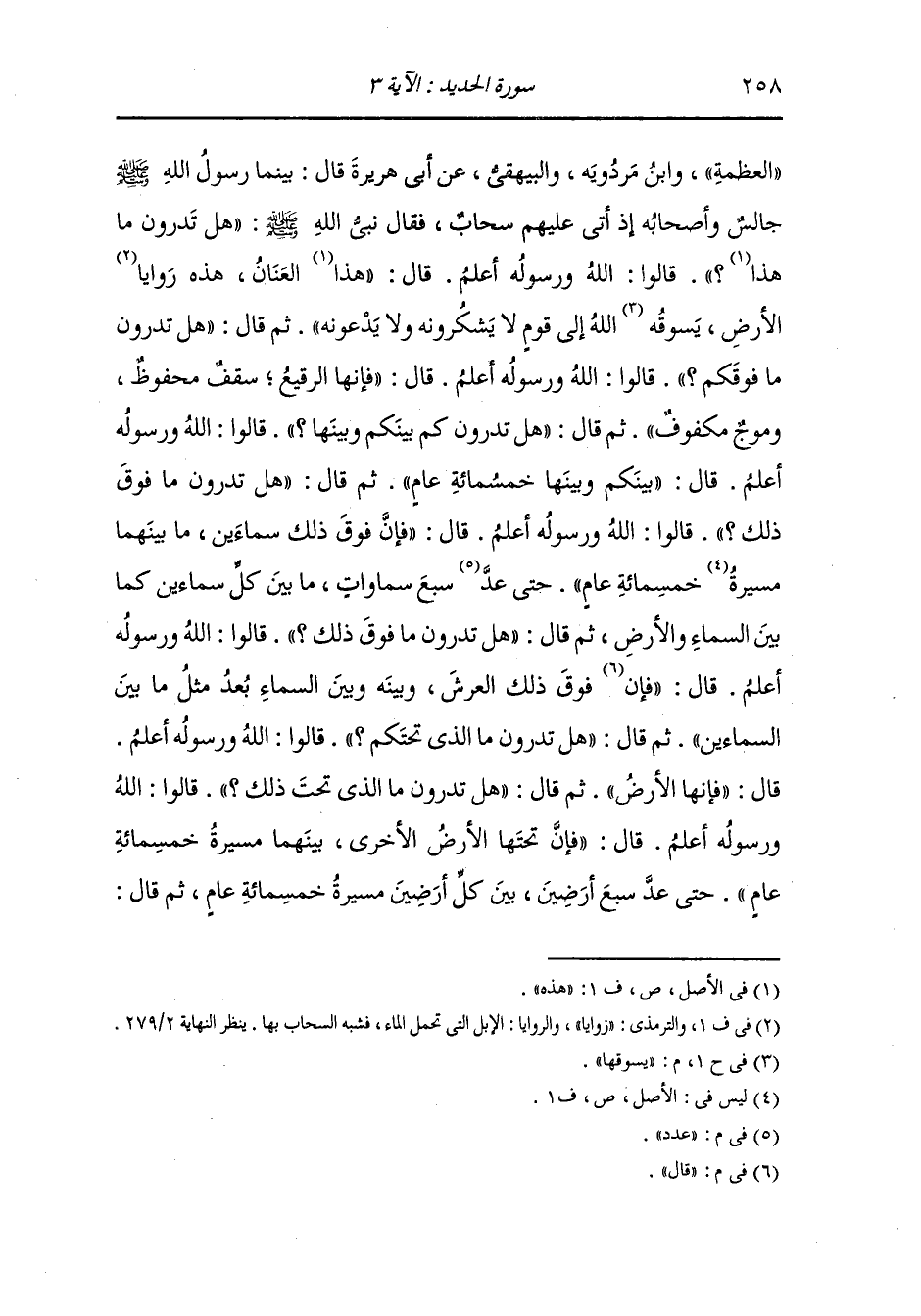 الشيخ في العظمة عن أبي هريرة قال : بينما رسول الله صلى الله عليه وسلم جالس وأصحابه إذ أتى عليهم سحاب فقال نبي الله صلى الله عليه وسلم : هل تدرون ما هذا قالوا : الله ورسوله أعلم قال : هذا العنان هذه روايا الأرض يسوقها الله إلى قوم لا يشكرونه ولا يدعونه ثم قال : هل تدرون ما فوقكم قالوا : الله ورسوله أعلم قال : فإنها الرقيع سقف محفوظ وموج مكفوف ، ثم قال : هل تدرون كم بينكم وبينها قالوا : الله ورسوله أعلم ، قال : بينكم وبينها خمسمائة سنة ثم قال : هل تدرون ما فوق ذلك قالوا : الله ورسوله أعلم قال : فإن فوق ذلك سماءين ما بينهما مسيرة خمسمائة سنة حتى عدد سبع سموات ما بين كل سماءين كما بين السماء والأرض ثم قال : هل تدرون ما فوق ذلك قالوا : الله ورسوله أعلم قال : فوق ذلك العرش وبينه وبين السماء بعد مثل ما بين السماءين ثم قال : هل تدرون ما الذي تحتكم قالوا : الله ورسوله أعلم قال : فإنها الأرض ثم قال : هل تدرون ما تحت ذلك قالوا : الله ورسوله أعلم قال : فإن تحتها الأرض الأخرى بينهما مسيرة خمسمائة عام حتى عد سبع أرضين بين كل أرضين مسيرة خمسمائة سنة ثم قال :