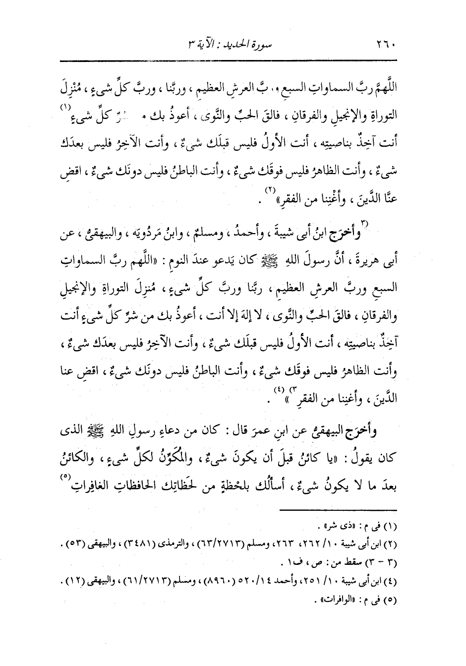 اللهم رب السموات السبع ورب العرش العظيم ربنا ورب كل شيء منزل التوراة والإنجيل والفرقان فالق الحب والنوى لا إله إلا أنت أعوذ بك من شر كل شيء أنت آخذ بناصيته أنت الأول فليس قبلك شيء وأنت الآخر فليس بعدك شيء وأنت الظاهر فليس فوقك شيء وأنت الباطن فليس دونك شيء اقض عنا الدين وأغننا من الفقر.