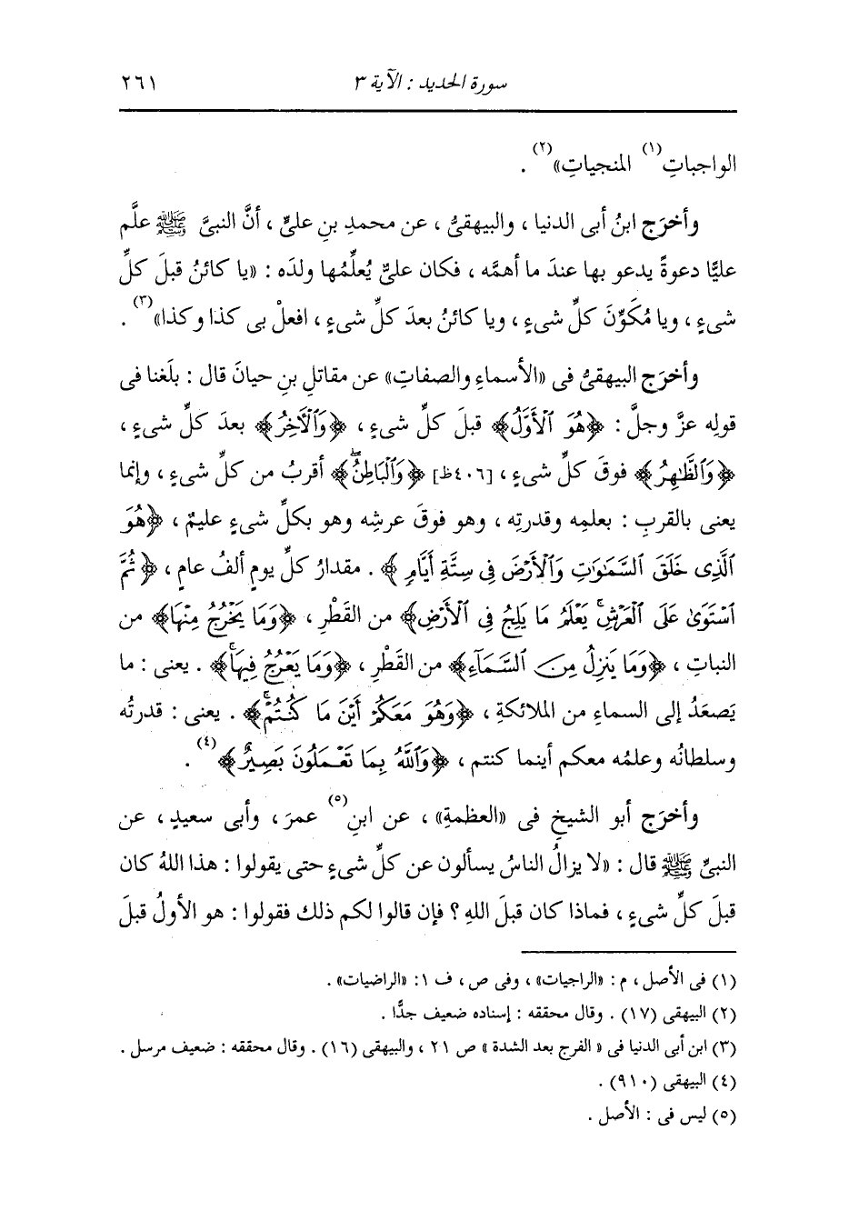 كل شيء وهو الآخر فليس بعده شيء وهو الظاهر فوق كل شيء وهو الباطن دون كل شيء وهو بكل شيء عليم.
