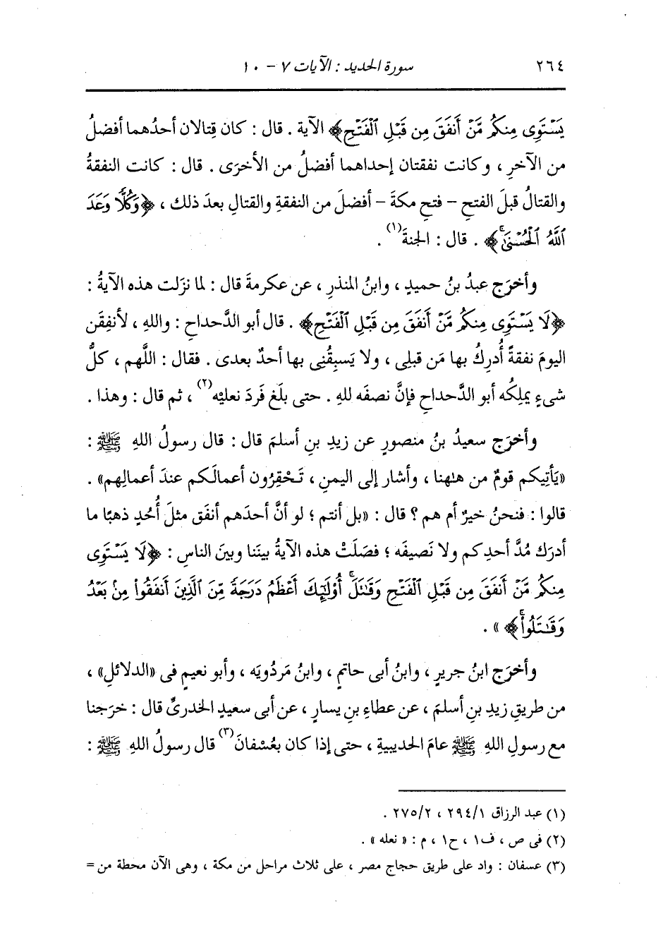 يوشك أن يأتي قوم تحقرون أعمالكم مع أعمالهم قلنا : من هم يا رسول الله أقريش قال : لا ولكنهم أهل اليمن هم أرق أفئدة وألين قلوبا فقلنا : أهم خير منا يا رسول الله قال : لو كان لأحدهم جبل من ذهب فأنفقه ما أدرك مد أحدكم ولا نصيفه إلا أن هذا فصل ما بيننا وبين الناس {لا يستوي منكم من أنفق من قبل الفتح وقاتل} الآية.