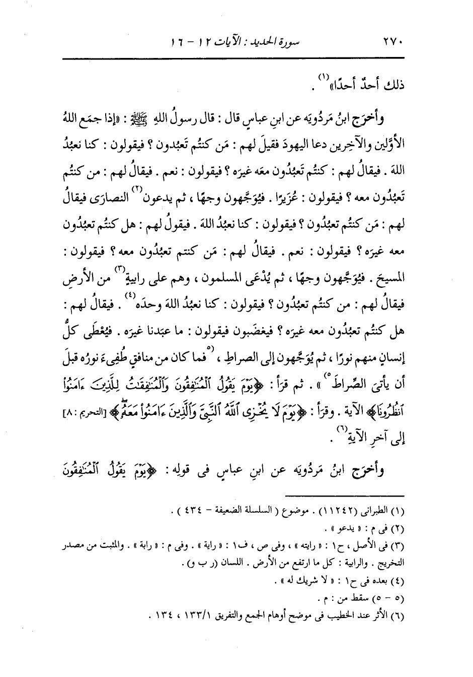 وأخرج عَبد بن حُمَيد ، وَابن جَرِير ، وَابن المنذر عن أبي فاختة قال : يجمع الله الخلائق يوم القيامة ويرسل الله على الناس ظلمة فيستغيثون ربهم فيؤتي الله كل مؤمن يومئذ نورا ويؤتي المنافقين نورا فينطلقون جميعا متوجهين إلى الجنة معهم نورهم فبينما هم كذلك إذ طفأ الله نور المنافقين فيترددوهن في الظلمة ويسبقهم المؤمنون بنورهم بين أيديهم فينادونهم {انظرونا نقتبس من نوركم} {فضرب بينهم بسور له باب باطنه} حيث ذهب المؤمنون فيه الرحمة ومن قبله الجنة ويناديهم المنافقون ألم نكن معكم قالوا : بلى ولكنكم فتنتم أنفسكم وتربصتم