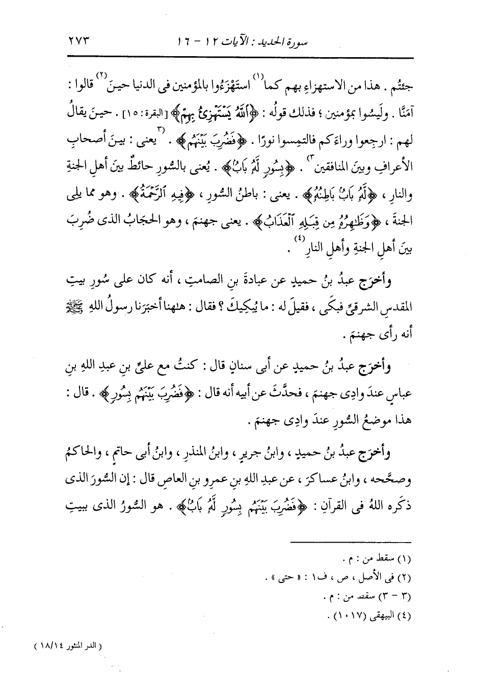 وأخرج عَبد بن حُمَيد ، وَابن المنذر ، وَابن أبي حاتم عن قتادة {فضرب بينهم بسور} قال : حائط بين الجنة والنار.