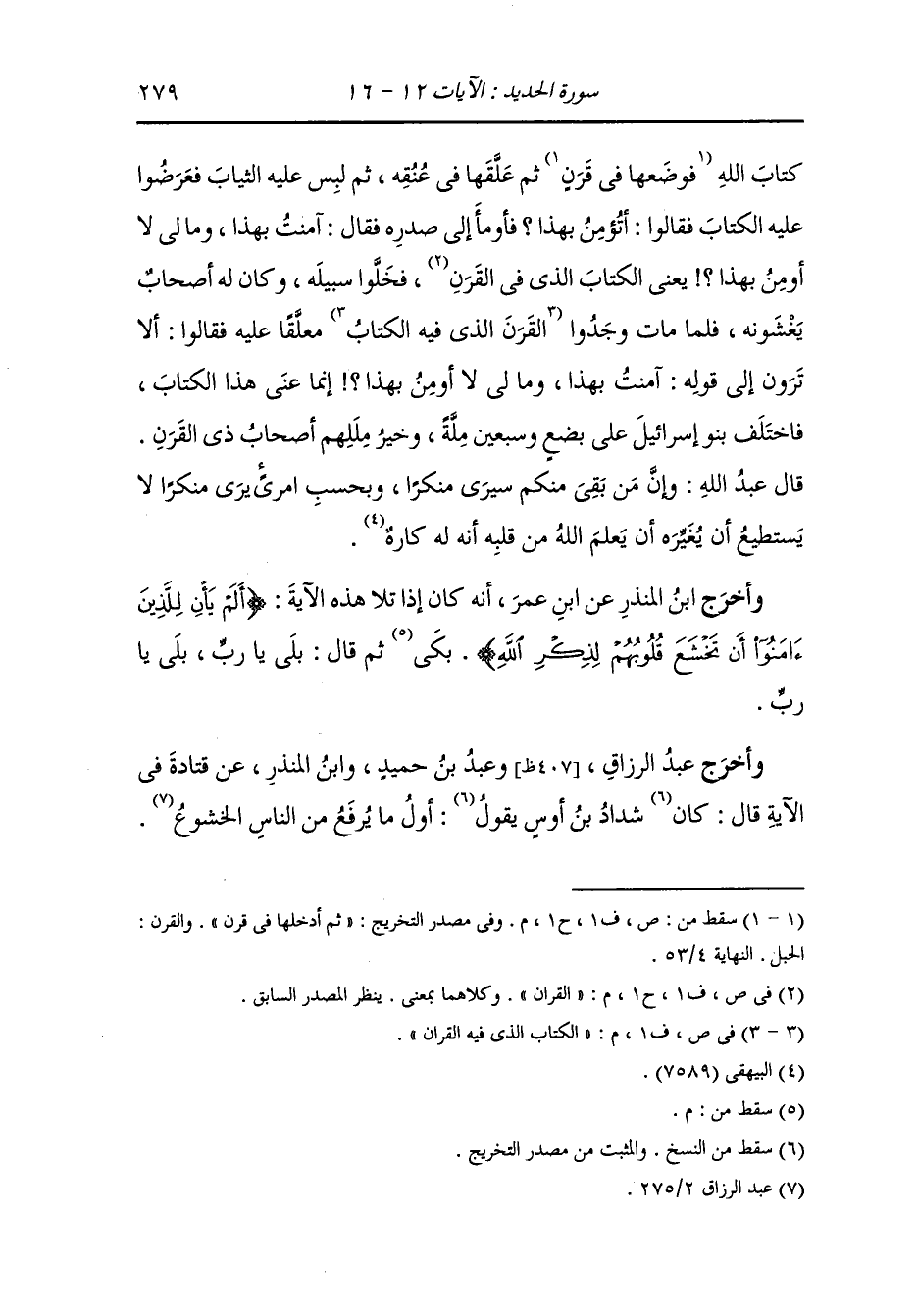 وأخرج ابن أبي شيبة عن أبي حرب بن أبي الأسود عن أبيه قال : جمع أبو موسى الأشعري القراء فقال : لا يدخلن عليكم إلا من جمع القرآن فدخلنا ثلاثمائة رجل فوعظنا وقال : أنتم قراء هذه البلد والله ليطولن عليكم الأمد فتقسو قلوبكم كما قست قلوب أهل الكتاب.
