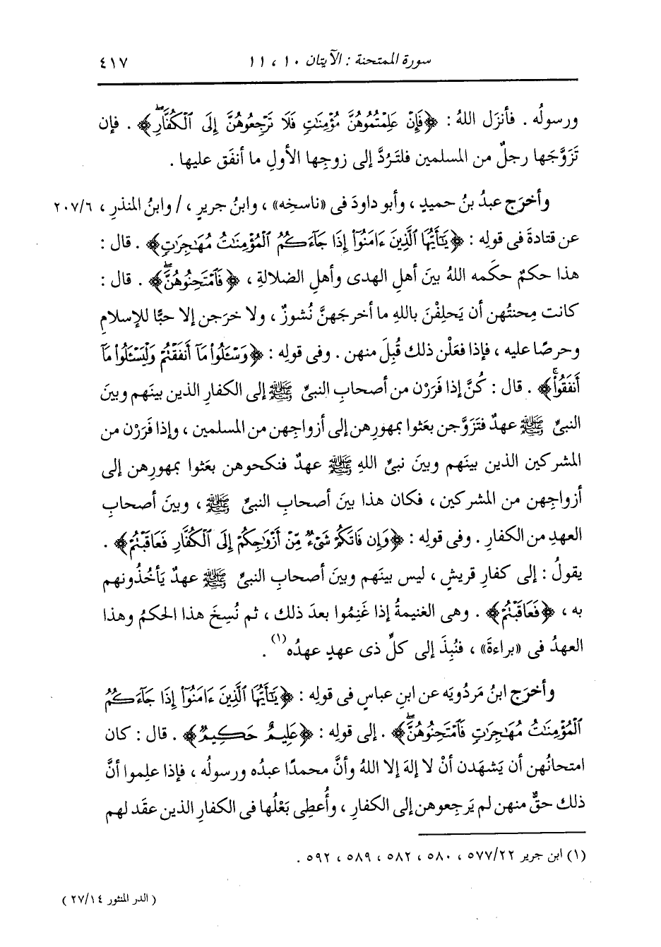 وأخرج ابن مردويه عن ابن شهاب رضي الله عنه قال : بلغنا أن الممتحنة أنزلت في المدة التي ماد فيها رسول الله صلى الله عليه وسلم كفار قريش من أجل العهد الذي كان بين رسول الله صلى الله عليه وسلم وبين كفار قريش في المدة فكان يرد على كفار قريش ما أنفقوا على نسائهم اللاتي يسلمن ويهاجرن وبعولتهن كفار ولو كانوا حربا ليست بين