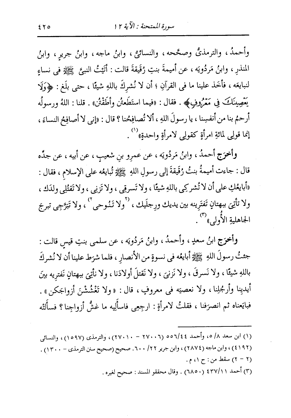 وأخرج البخاري ومسلم ، وَابن مردويه عن ابن عباس رضي الله عنهما قال : شهدت الصلاة يوم الفطر مع النَّبِيّ صلى الله عليه وسلم فنزل فأقبل حتى أتى النساء فقال : {يا أيها النَّبِيّ إذا جاءك المؤمنات يبايعنك على أن لا يشركن بالله شيئا ولا يسرقن ولا يزنين} حتى فرغ من الآية كلها ثم قال حين فرغ : أنتن على ذلك قالت امرأة : نعم