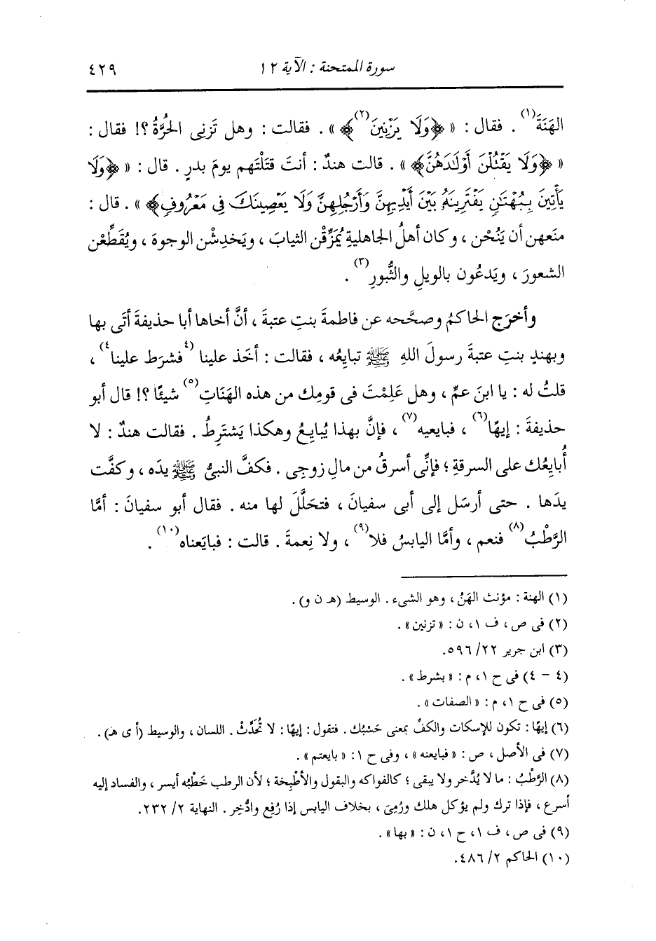 وأخرج ابن سعد وأحمد ، وعَبد بن حُمَيد والترمذي وحسنه ، وَابن ماجة ، وَابن جَرِير ، وَابن المنذر ، وَابن أبي حاتم ، وَابن مردويه عن أم سلمة الأنصارية قالت : قالت امرأة من النسوة ما هذا المعروف الذي لا ينبغي لنا أن نعصيك فيه قال : لا تنحن قلت يا رسول الله : إن بني فلان أسعدوني على عمي ولا بد لي من قضائهن فأبى علي فعاودته مرارا
