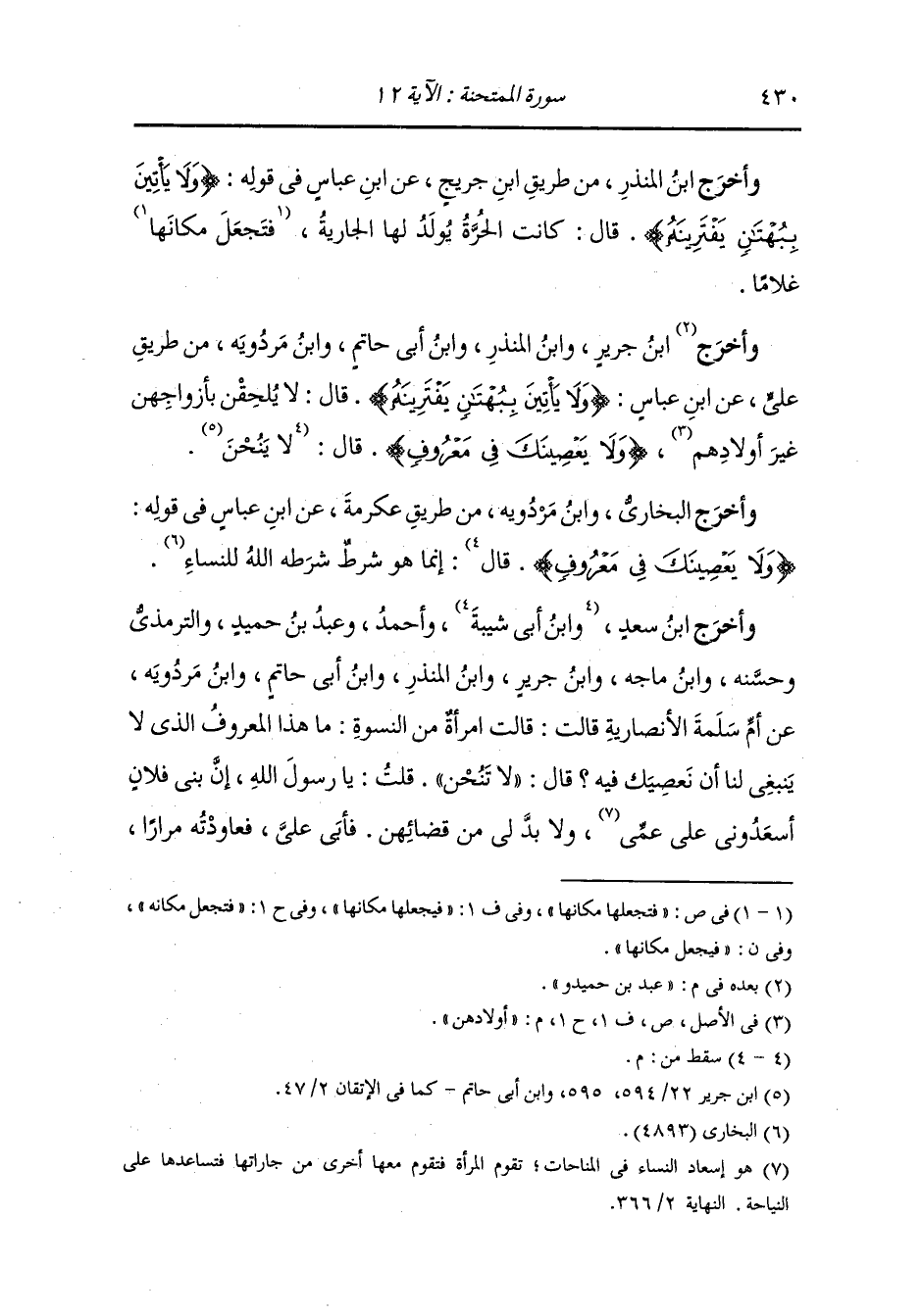 وأخرج سعيد بن منصور ، وَابن منيع ، وَابن سعد ، وَابن مردويه عن أبي المليح قال : جاءت امرأة من الأنصار تبايع النَّبِيّ صلى الله عليه وسلم فلما شرط عليها أن لا تشركن بالله شيئا ولا تسرقن ولا تزنين أقرت فلما قال : {ولا يعصينك في معروف} قال : أن لا تنوحي فقالت : يا رسول الله إن فلانه أسعدتني أفأسعدها ثم لا أعود فلم يرخص لها ، مرسل حسن الإسناد.