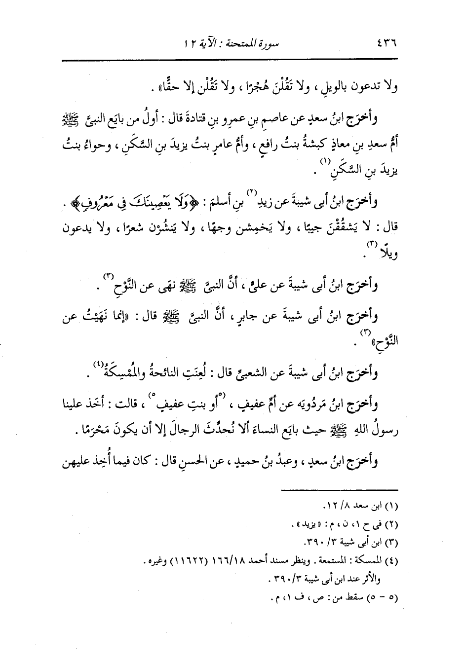 وأخرج عَبد بن حُمَيد ، وَابن المنذر عن عكرمة رضي الله عنه قال : لما نزلت هذه الآية {إذا جاءك المؤمنات يبايعنك} قال : فإن المعروف الذي لا يعصي فيه أن لا يخلو الرجل والمرأة وحدانا وأن لا ينحن نوح الجاهلية ، قال : فقالت خولة بنت حكيم الأنصارية : يا رسول الله إن فلانة أسعدتني وقد مات أخوها فأنا أريد أن أجزيها ، قال : فاذهبي فاجزيها ثم تعالي فبايعي ، وأخرجه ابن جرير ، وَابن مردويه عن عكرمة عن ابن عباس رضي الله عنهما موصولا والله أعلم.