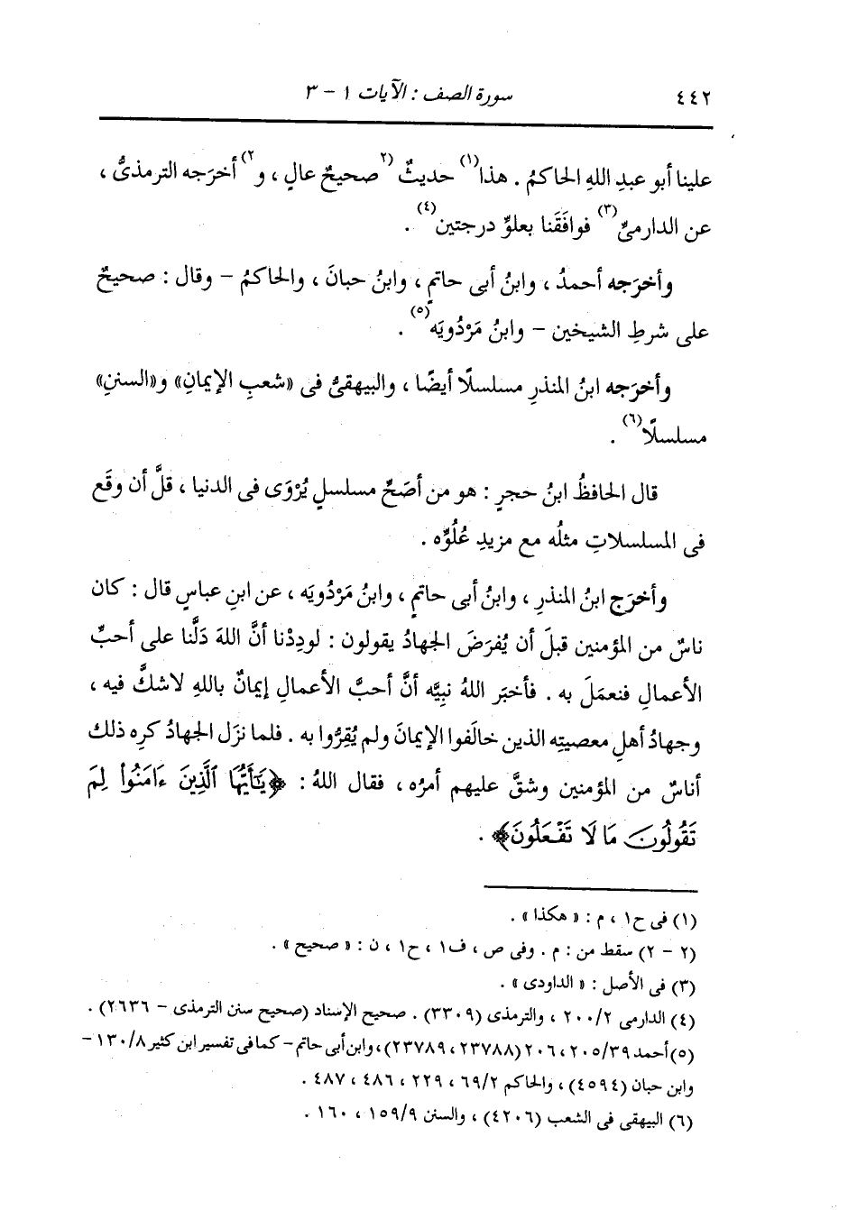 أَخرَج عَبد بن حميد ، وَابن مردويه عن ابن عباس قال : قال ناس : لو نعلم أحب الأعمال إلى الله لفعلناه فأخبرهم الله فقال : {إن الله يحب الذين يقاتلون في سبيله صفا كأنهم بنيان مرصوص} فكرهوا ذلك فأنزل الله {يا أيها الذين آمنوا لم تقولون ما لا تفعلون كبر مقتا عند الله أن تقولوا ما لا تفعلون}.