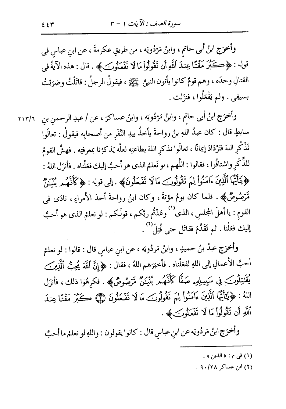 وأخرج ابن مردويه عن أبي هريرة قال : قالوا : لو كنا نعلم أي الأعمال أحب إلى الله فنزلت {يا أيها الذين آمنوا لم تقولون ما لا تفعلون} إلى قوله : {بنيان مرصوص}.
