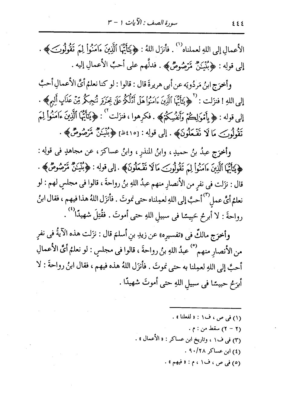 وأخرج عَبد بن حُمَيد ، وَابن جَرِير ، وَابن المنذر عن أبي صالح قال : قال المسلمون : لو أمرنا بشيء نفعله فنزلت {يا أيها الذين آمنوا لم تقولون ما لا تفعلون} قال : بلغني أنها نزلت في الجهاد كان الرجل يقول : قاتلت وفعلت ولم يكن فعل فوعظهم الله في ذلك أشد الموعظة.