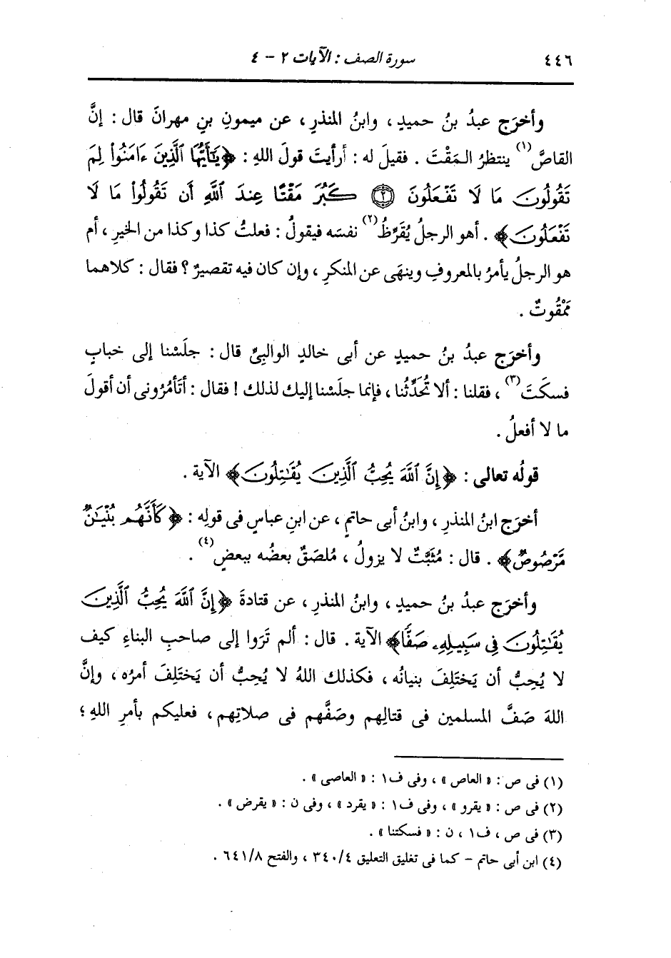 وأخرج ابن مردويه عن البراء بن عازب قال : كان رسول الله صلى الله عليه وسلم إذا أقيمت الصلاة يمسح مناكبنا وصدورنا ويقول : لا تختلفوا فتختلف قلوبكم إن الله وملائكته يصلون على الصفوف الأول وصلوا المناكب بالمناكب والأقدام بالأقدام فإن الله يحب في الصلاة ما يحب في القتال {صفا كأنهم بنيان مرصوص}.