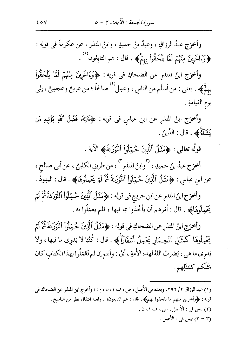 وأخرج عَبد بن حُمَيد عن قتادة {كمثل الحمار يحمل أسفارا} قال : يحمل كتبا على ظهره لا يدري ماذا عليه.