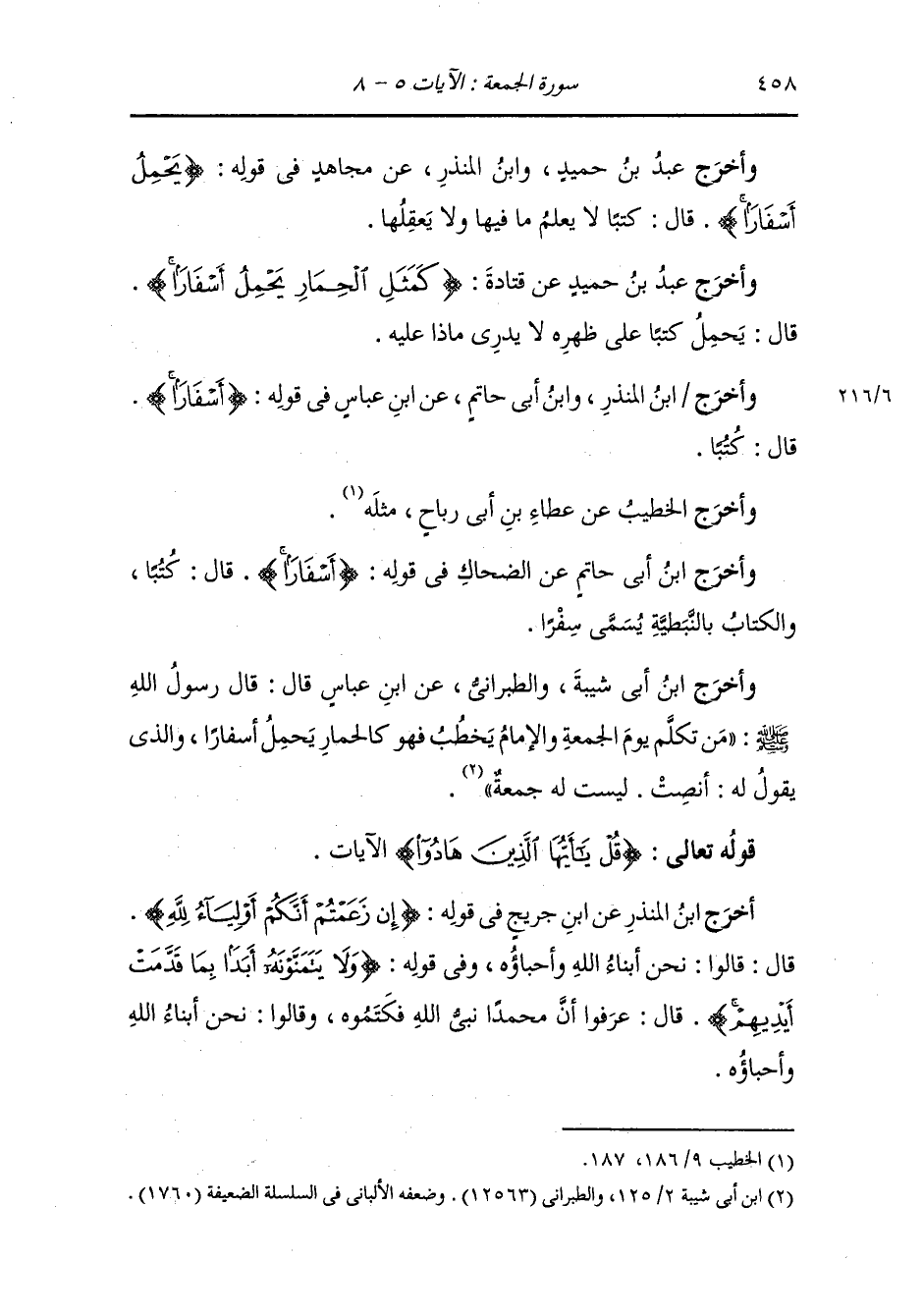 وأخرج عبد الرزاق ، وَابن المنذر عن معمر قال : تلا قتادة {ثم تردون إلى عالم الغيب والشهادة} قال : إن الله أذل ابن آدم بالموت لا أعلمه إلا رفعه ، قوله تعالى : {يا أيها الذين آمنوا إذا نودي للصلاة من يوم الجمعة} الآية.