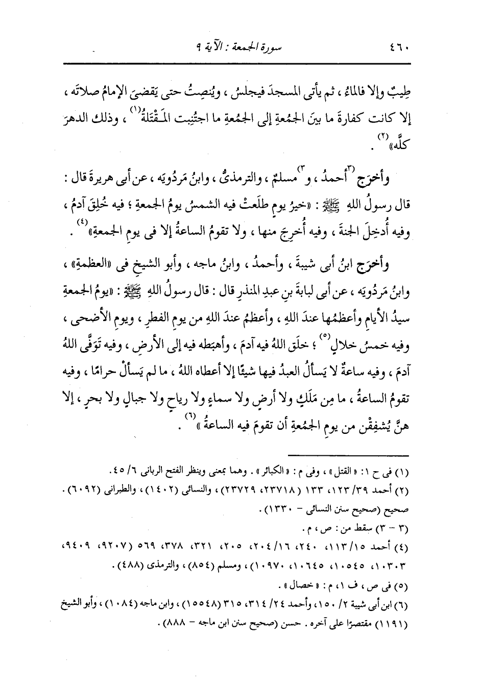 وأخرج أحمد ، وَابن مردويه عن سعد بن عبادة أن رجلا من الأنصار أتى رسول االله صلى الله عليه وسلم فقال : أخبرنا عن يوم الجمعة ماذا فيه من الخير قال : فيه خمس