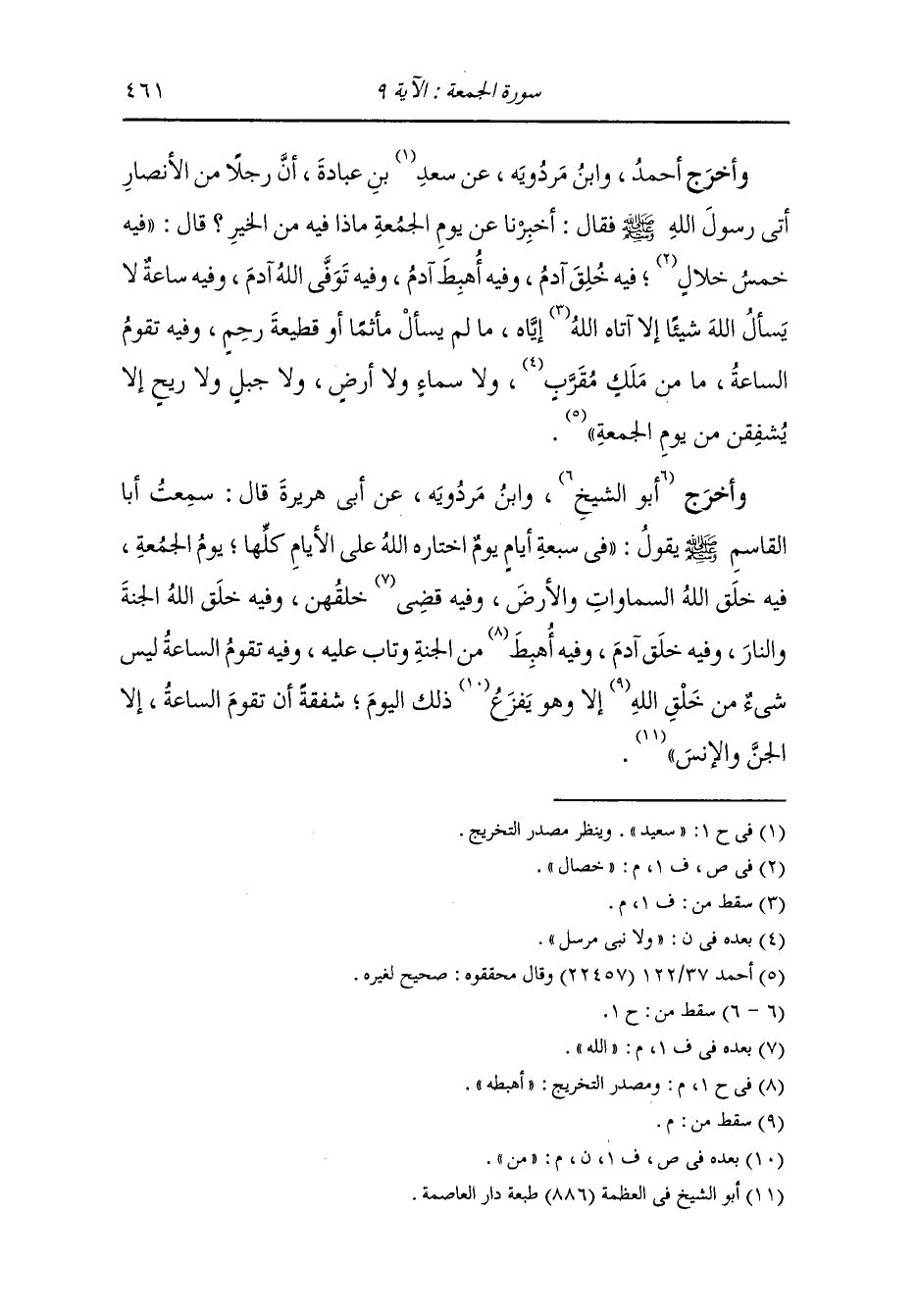 وأخرج ابن أبي شيبة وأحمد وأبو داود والنسائي ، وَابن ماجة والدارمي ، وَابن خزيمة ، وَابن حبان والحاكم عن أوس بن أوس أن رسول الله صلى الله عليه وسلم قال : إن من أفضل أيامكم