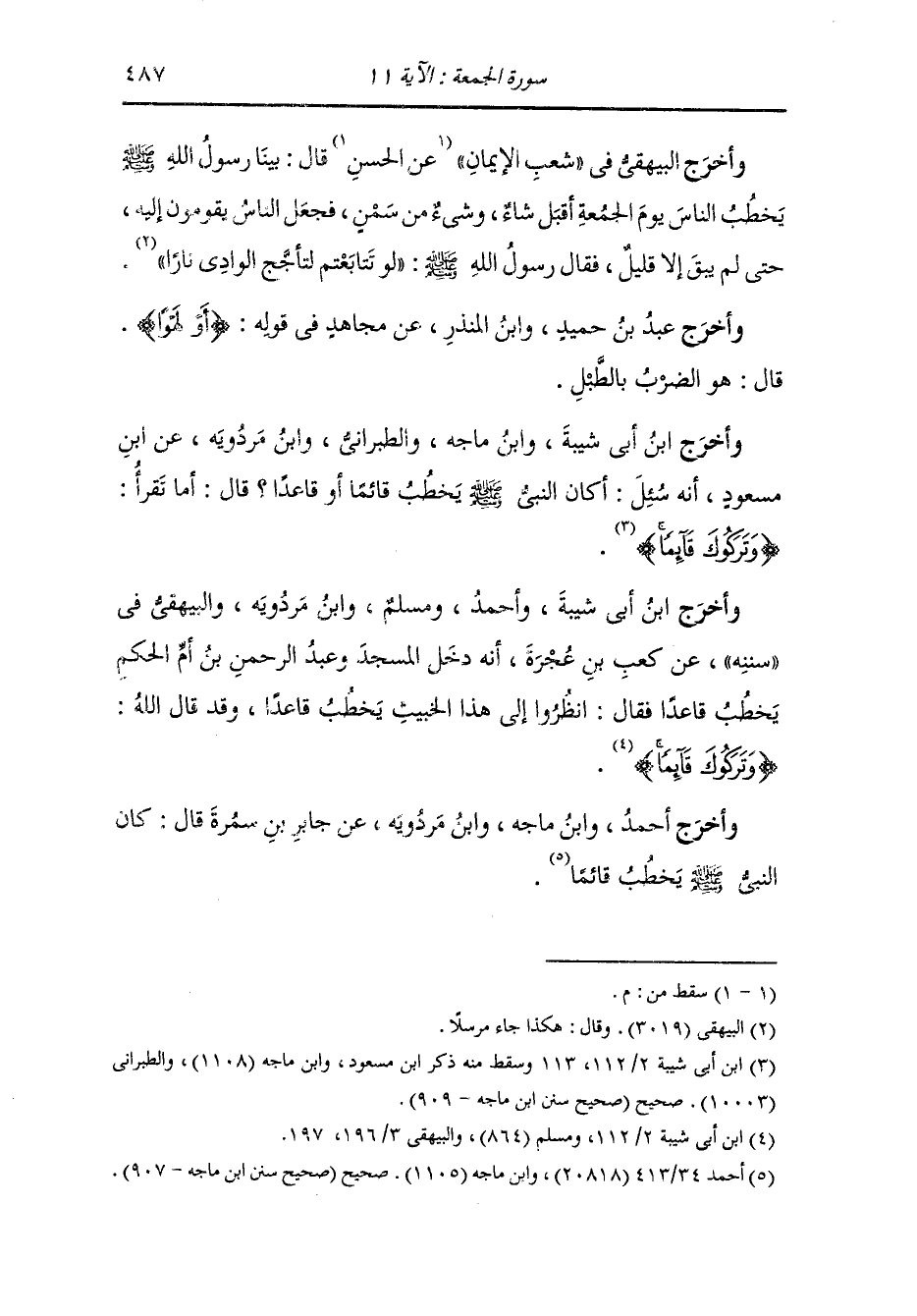 وأخرج ابن أبي شيبة عن ابن سيرين أنه سئل عن خطبة النَّبِيّ صلى الله عليه وسلم يوم الجمعة فقرأ {وتركوك قائما} ، واخرج ابن أبي شيبة عن عمرو بن مرة قال : سألت أبا عبيدة رضي الله عنه عن الخطبة يوم الجمعة فقرأ {وتركوك قائما}.