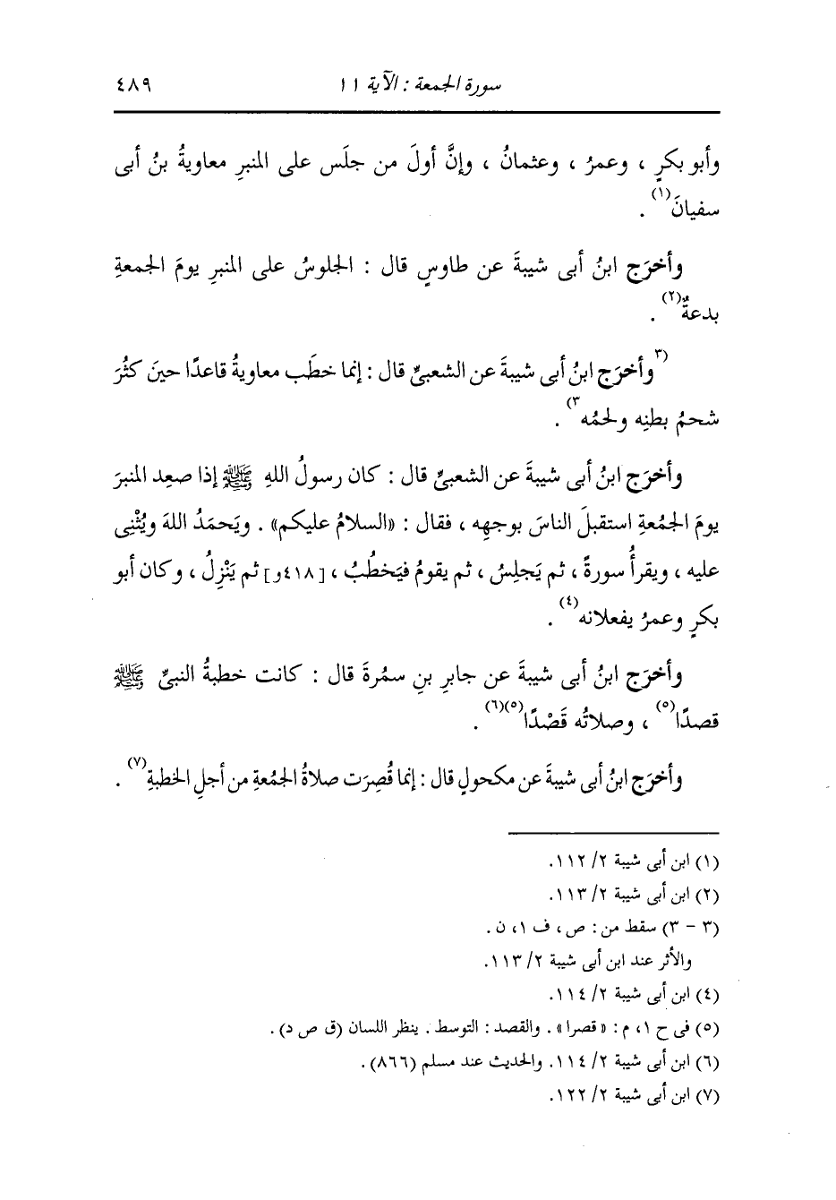 وأخرج ابن أبي شيبة عن ابن سيرين أنه سئل عن خطبة النَّبِيّ صلى الله عليه وسلم يوم الجمعة فقرأ {وتركوك قائما}.