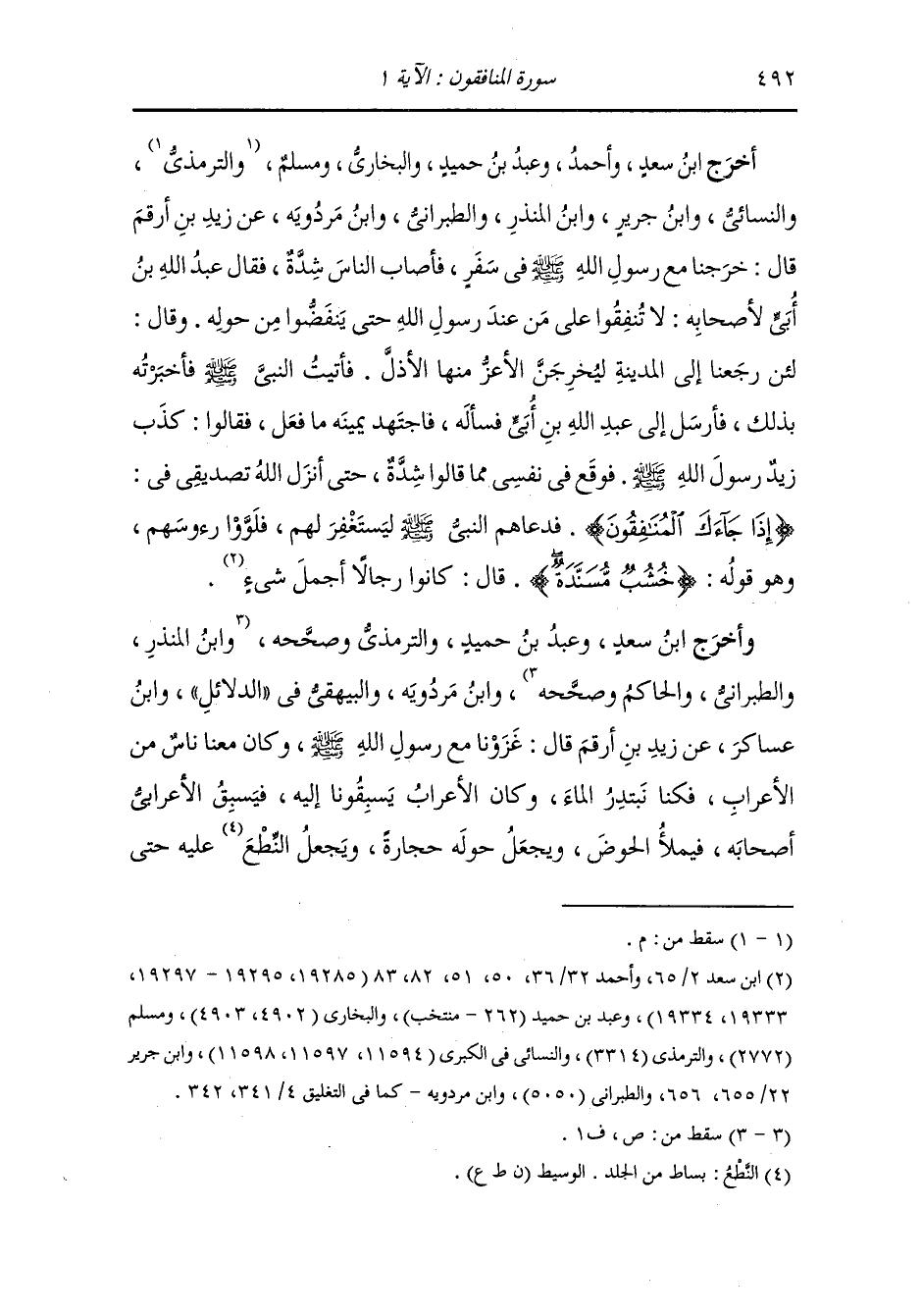 يجيء أصحابه فأتى من الأنصار أعرابيا فأرخى زمام ناقته لتشرب فأبى أن يدعه فانتزع حجرا فغاض الماء فرفع الأعرابي خشبة فضرب بها رأس الأنصاري فشجه فأتى عبد الله بن أبي رأس المنافقين فأخبره وكان من أصحابه فغضب وقال : لا تنفقوا على من عند رسول الله حتى ينفض من حوله يعني الأعراب وكانوا يحضرون رسول الله صلى الله عليه وسلم عند الطعام وقال عبد الله لأصحابه : إذا انفضوا من عند محمد فائتوا محمدا بالطعام فليأكل هو ومن عنده ثم قال لأصحابه : إذا رجعتم إلى المدينة فليخرج الأعز منها الأذل قال زيد : وأنا ردف عمي فسمعت وكنا أخواله عبد الله فأخبرت عمي فانطلق فأخبر رسول الله صلى الله عليه وسلم فأرسل إليه رسول الله فحلف وجحد فصدقه رسول الله صلى الله عليه وسلم وكذبني فجاء إلى عمي فقال : ما أردت إلى أن مقتك رسول الله صلى الله عليه وسلم وكذبك وكذبك المسلمون فوقع علي من الهم ما لم يقع على أحد قط فبينما أنا أسير وقد خفقت برأسي من الهم إذا آتاني رسول الله صلى الله عليه وسلم فعرك أذني وضحك في وجهي فما كان يسرني أن لي بها الخلد أو الدنيا ثم إن أبا بكر لحقني فقال : ما قال لك رسول الله صلى الله عليه وسلم قلت : ما قال لي شيئا إلا أنه عرك أذني