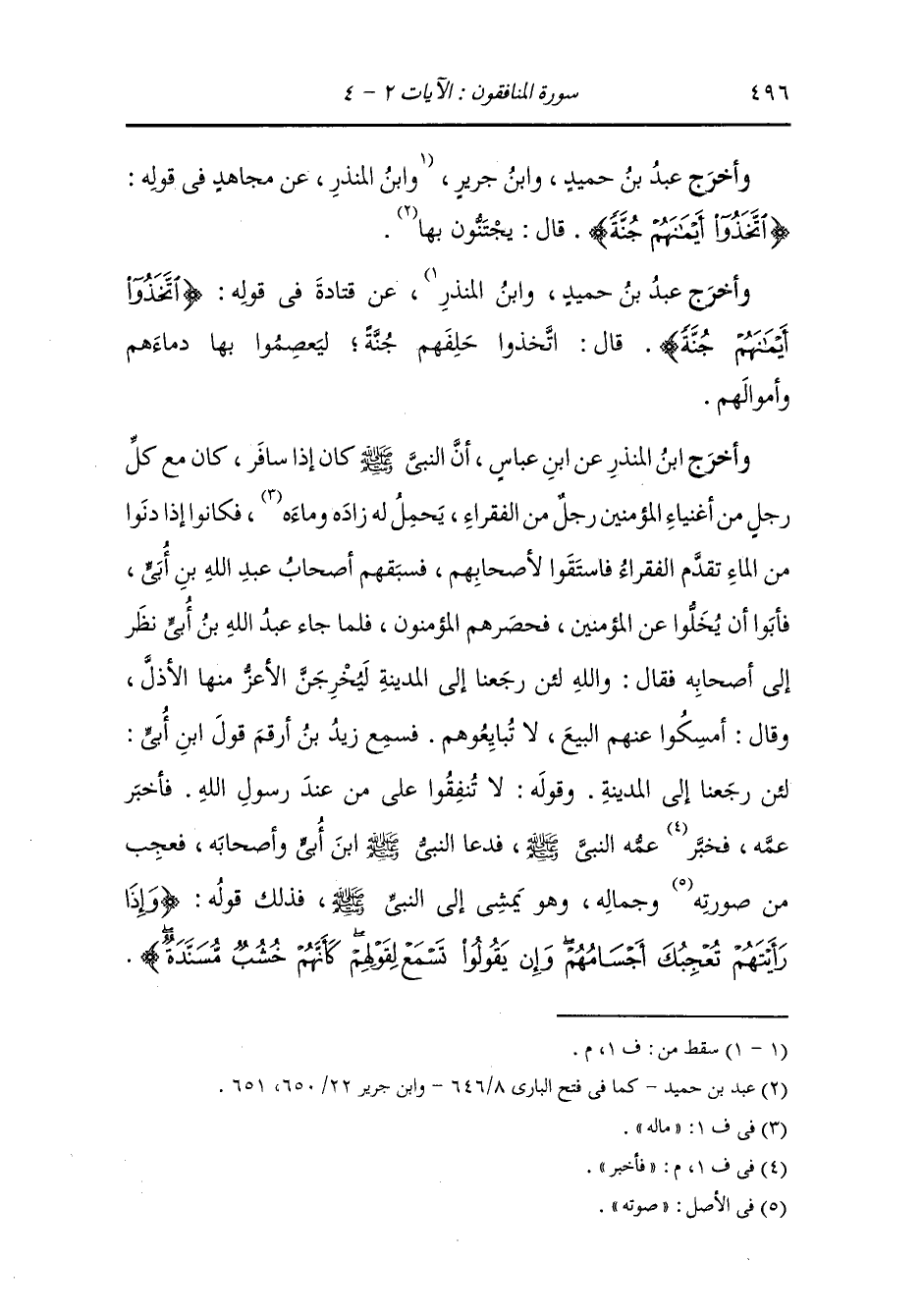 فعرفه النَّبِيّ صلى الله عليه وسلم فلما أخبره حلف ما قاله فذلك قوله : {اتخذوا أيمانهم جنة} {قالوا نشهد إنك لرسول الله} وذلك قوله : {إذا جاءك المنافقون قالوا نشهد إنك لرسول الله} وكل شيء أنزله في المنافقين فإنما أراد عبد الله ابن أبي.