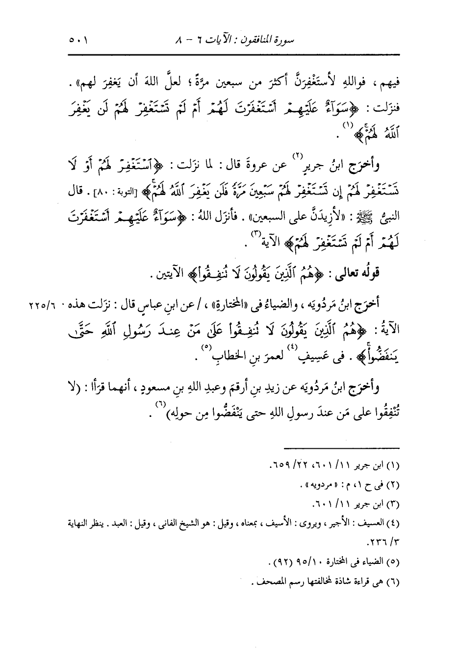 وأخرج عبد الرزاق ، وعَبد بن حُمَيد عن قتادة في قوله : {هم الذين يقولون لا تنفقوا على من عند رسول الله} قال : إن عبد الله بن أبي قال لأصحابه : لا تنفقواعلى من عند رسول الله فإنكم لو لم تنفقوا عليهم قد انفضوا وفي قوله : {يقولون لئن رجعنا إلى المدينة ليخرجن الأعز منها الأذل} قال : قد قالها منافق عظيم النفاق في رجلين اقتتلا أحدهما غفاري والآخر جهني فظهر الغفاري على الجهني وكان بين جهينة وبين الأنصار حلف فقال رجل من المنافقين : وهو عبد الله بن أبي يا بني الأوس والخزرج عليكم صاحبكم وحليفكم ، ثم قال : والله ما مثلنا ومثل محمد إلا كما قال القائل : سمن كلبك يأكلك ، والله لئن رجعنا إلى المدينة ليخرجن الأعز منها الأذل ، فسعى بها بعضهم إلى نبي الله صلى الله عليه وسلم فقال عمر : يا نبي الله مر معاذا أن يضرب عنق هذا المنافق ، فقال : لا يتحدث الناس أن محمدا يقتل أصحابه ، وذكر لنا أنه كثر على رجلين من المنافقين عنده فقال عمر : هل يصلي قالوا : نعم ولا خير في صلاته ، قال نهيت عن المصلين نهيت عن المصلين نهيت عن المصلين.