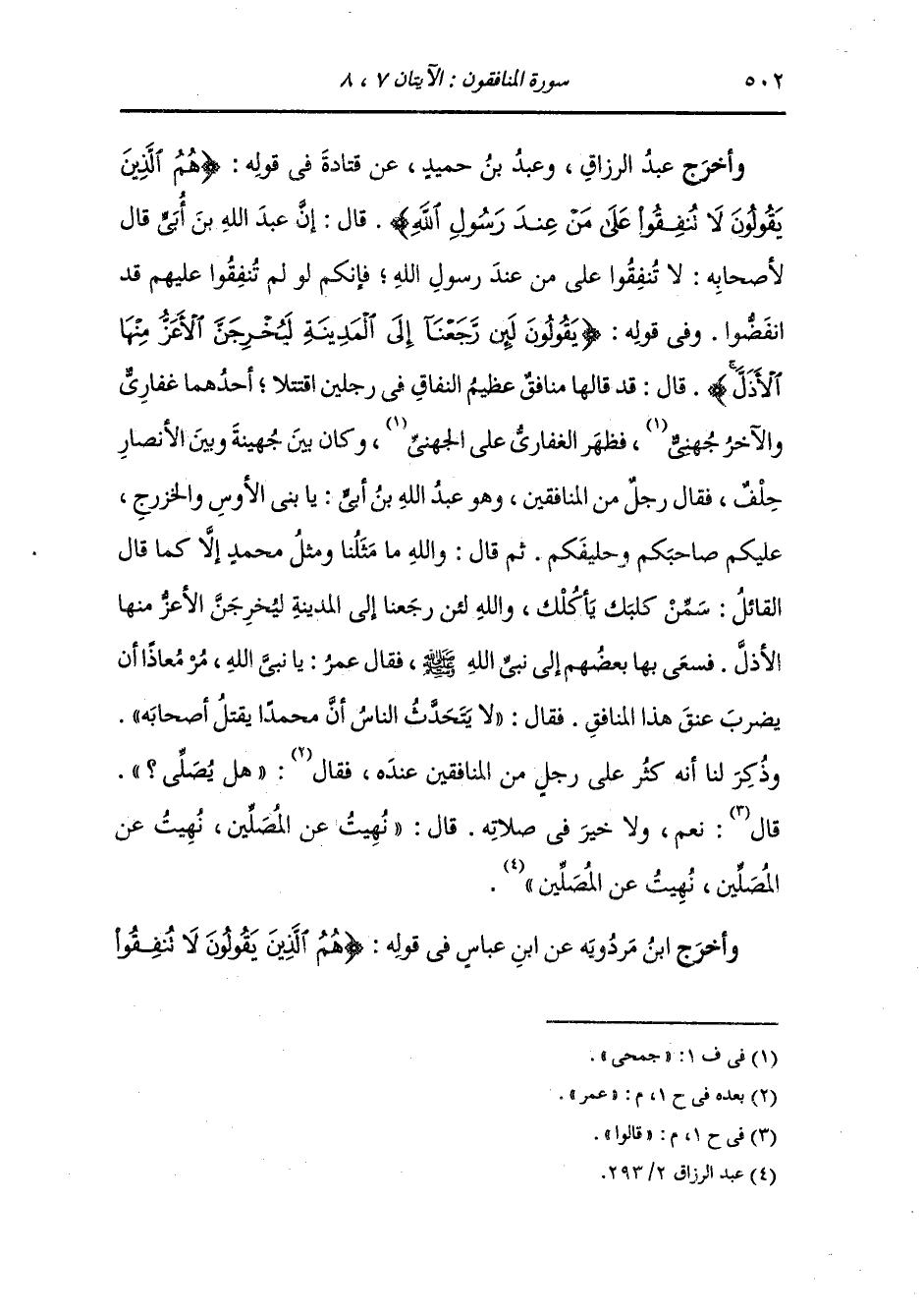 على من عند رسول الله حتى ينفضوا} يقول : لا تطعموا محمدا وأصحابه حتى تصيبهم مجاعة فيتركوا نبيهم وفي قوله : {لئن رجعنا إلى المدينة ليخرجن الأعز منها الأذل} قال : قال ذلك عبد الله بن أبي رأس المنافقين وأناس معه من المنافقين.