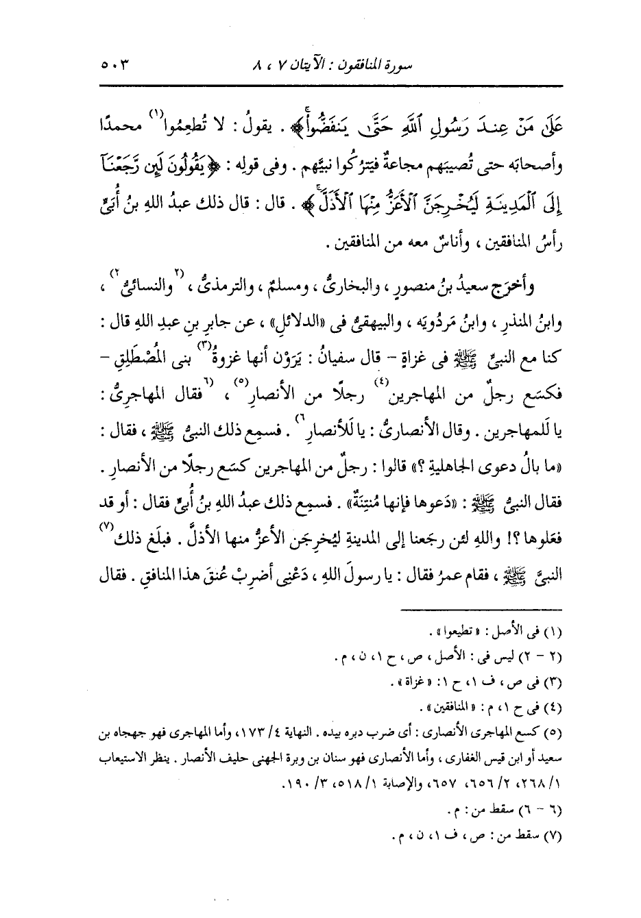 النبي صلى الله عليه وسلم : دعه لا يتحدث الناس أن محمدا يقتل أصحابه زاد الترمذي فقال له ابن عبد الله : والله لا تنقلب حتى تقر أنك الذليل ورسول الله صلى الله عليه وسلم العزيز ففعل.