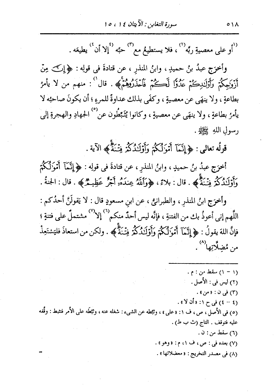 وأخرج ابن أبي شيبة عن أبي الضحى قال : قال رجل وهو عند عمر : اللهم إني أعوذ بك من الفتنة أو الفتن فقال عمر : أتحب أن لا يرزقك الله مالا ولا ولدا أيكم استعاذ من الفتن فليستعذ من مضلاتها.