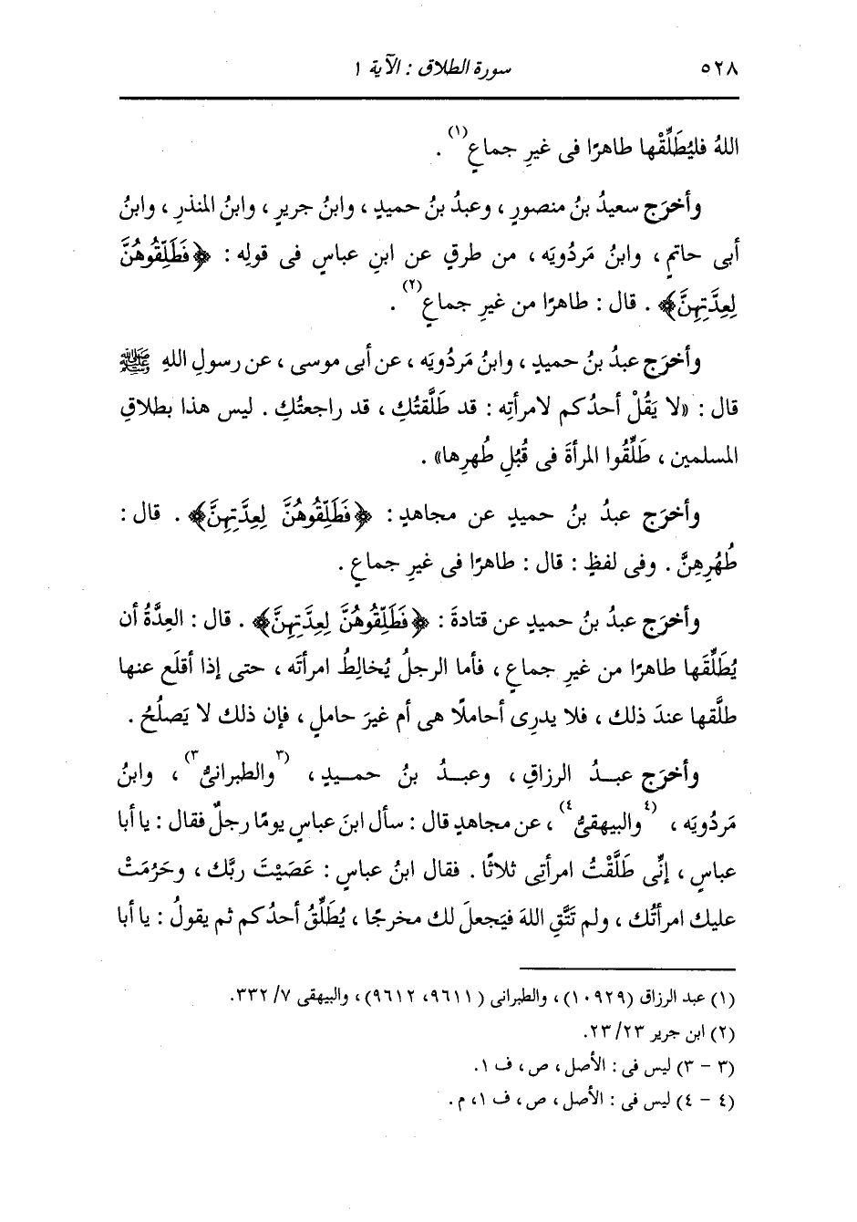 وَأخرَج عبد الرزاق ، وَابن المنذر عن ابن عباس قال : الطلاق على أربعة منازل منزلان حلال ومنزلان حرام فأما الحرام فأن يطلقها حين يجامعها لا يدري أشتمل الرحم على شيء أم لا؟ وأن يطلقها وهي حائض وأما الحلال فأن يطلقها لأقرائها عن غير جماع وأن يطلقها مستبينا حملها..